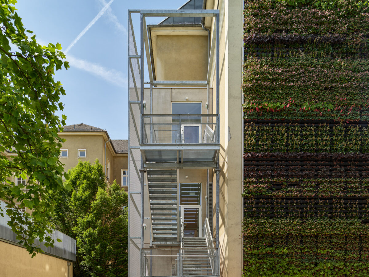 Eine Fluchtwegs-Verkürzung und die Barrierefreiheit wird mit einem angebauten Treppenhaus inkl. Aufzug im Innenhof erreicht.